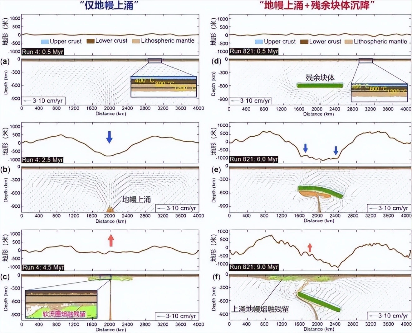 图4:代表性数值模型结果。a)-c)仅地幔上涌的模型。e)-f)地幔上涌与沉降残余块体共存的模型。