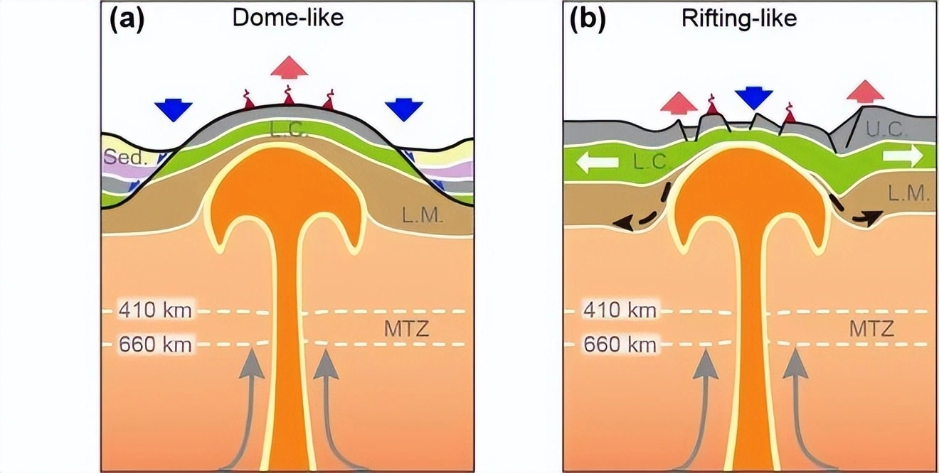 a)图d的切面位置图。b)图f的切面位置图。c)图g的切面位置图。d)东北亚地幔波速结构切面。e)东北亚750公里深处的平均波速结构。f)黄石-斯内克河平原下方的地幔波速结构切面。g)中国南海下方的地幔波速结构切面。图3::研究揭示地幔柱的地形响应以抬升为主。取决于岩石圈的先存应力状态,地幔柱可以导致地表出现长波长a)或短波长b)的抬升。